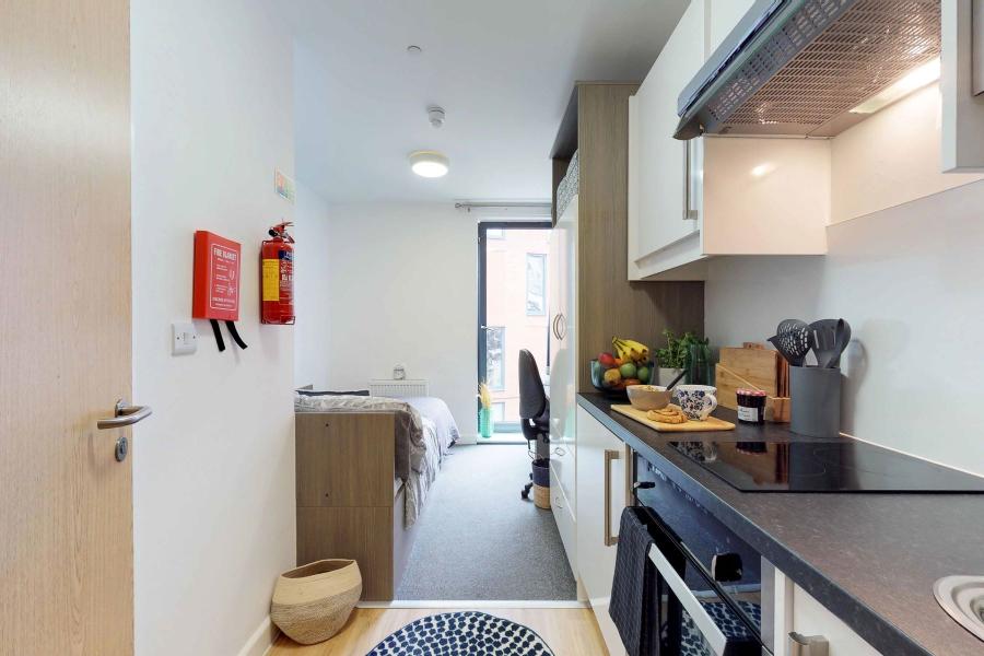 Se trata de una residencia moderna que dispone de estudios privados, cada uno con cama doble con espacio de almacenamiento inferior, escritorio y baño privado. La cocina está totalmente equipada con fogones, horno, nevera y congelador, ideal para una estancia independiente.